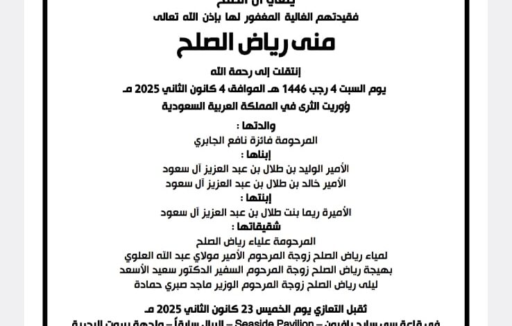 ليلى الصلح حمادة تتقبل العزاء بوفاة شقيقتها الأميرة منى غداً الخميس