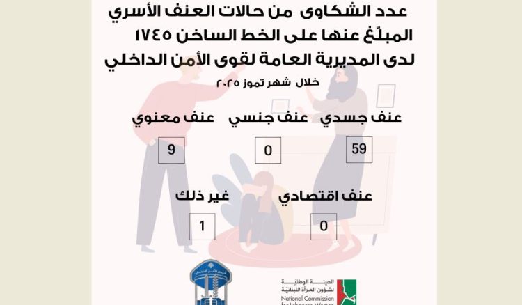 عممت المديرية العامة لقوى الأمن الداخلي عدد الشكاوى من حالات العنف الأسري المبلّغ عنها على الخط الساخن 1745 لشهر تموز 2025. جاءت كالآتي: