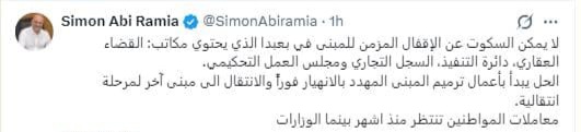 كتب النائب سيمون ابي رميا عبر منصة “X“: “لا يمكن السكوت عن الإقفال المزمن للمبنى في بعبدا الذي يحتوي مكاتب: القضاء العقاري، دائرة التنفيذ، السجل التجاري ومجلس العمل التحكيمي”.