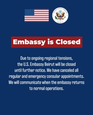 اعلنت السفارة الاميركية في بيروت في بيان، بانه نظرًا للتوترات الإقليمية المستمرة، ستظل سفارة الولايات المتحدة في بيروت مغلقة حتى إشعار آخر. تم إلغاء جميع المواعيد القنصلية الأخرى، العادية منها والطارئة. واردفت “سنوافيكم بالتفاصيل حال عودة السفارة إلى العمل بشكل طبيعي”.