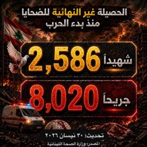 صدر عن مركز عمليات طوارئ الصحة التابع لوزارة الصحة العامة، بيانا اعلن ان الحصيلة التراكمية الاجمالية للعدوان منذ 2 آذار حتى 28 نيسان باتت كالآتي: بلغت ٢,٥٨٦ شهيداً و ٨,٠٢٠ جريحاً.
